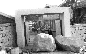 昨日,工作室大院前仍矗立着两座巨石,每只高约1.5米,宽逾1米,重数吨,几乎将大门封死。石头旁,地面上仍留有一摊血迹。院内,多处房屋受损。